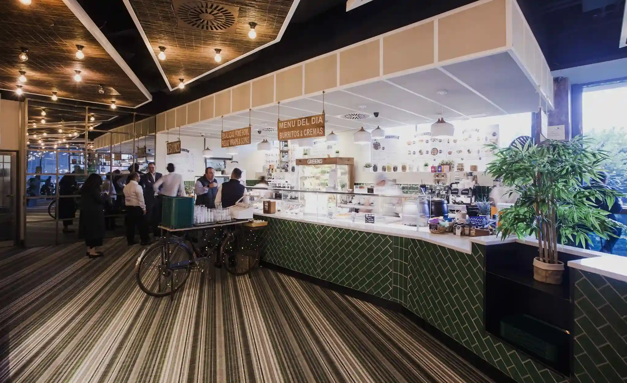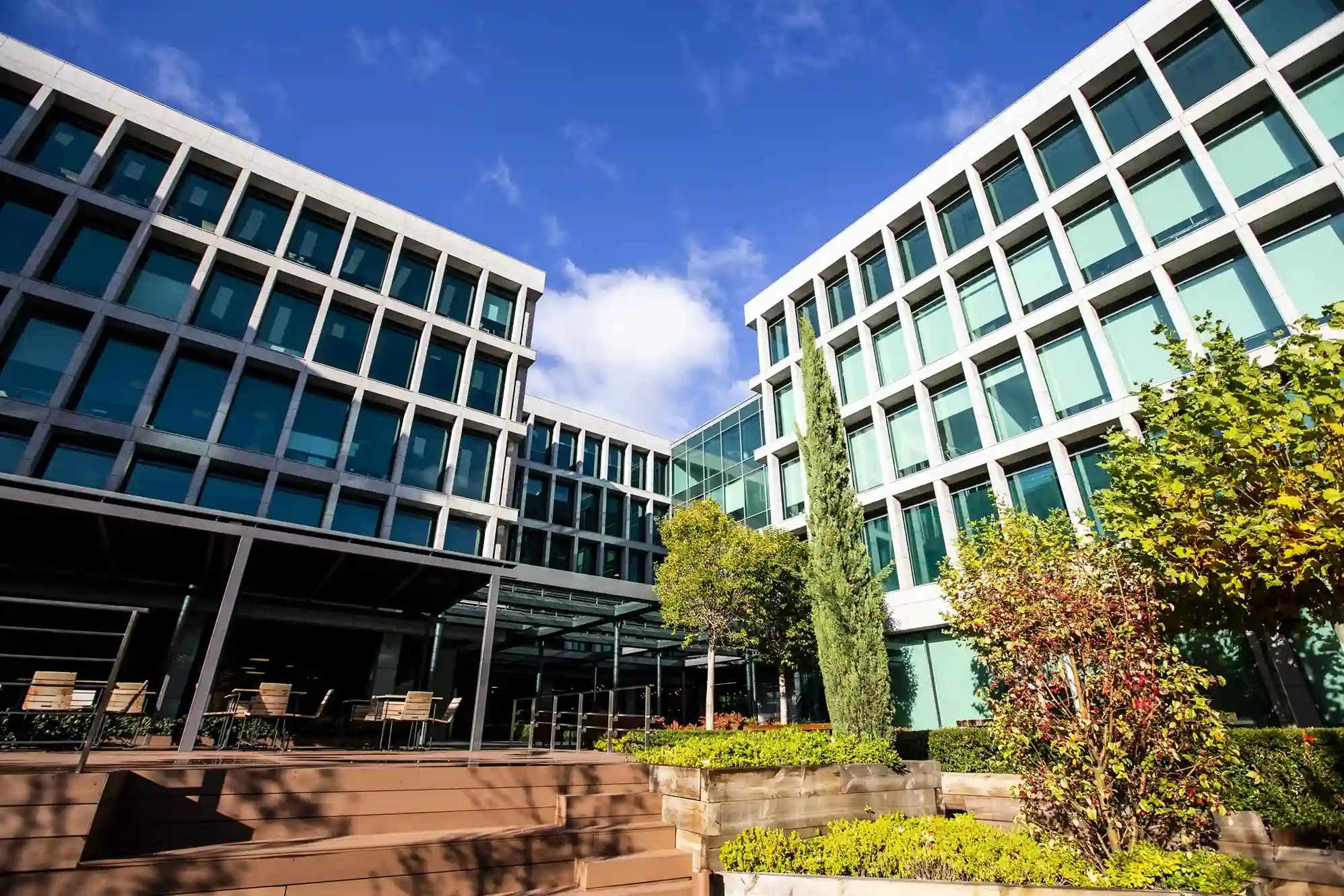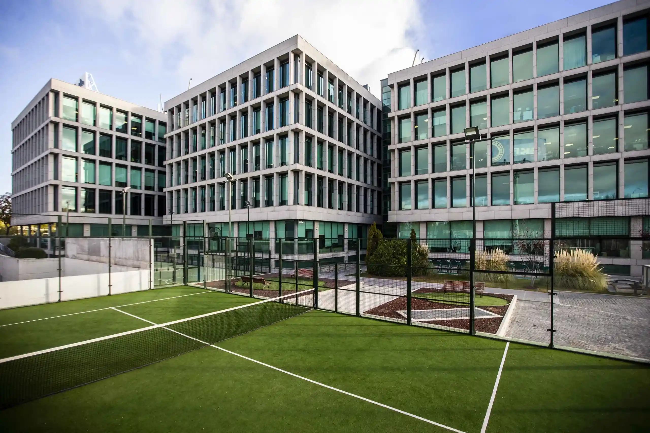 Complejo de oficinas formado por 4 edificios de cinco plantas, que pueden conectarse entre ellas, alrededor de un espacio ajardinado central.